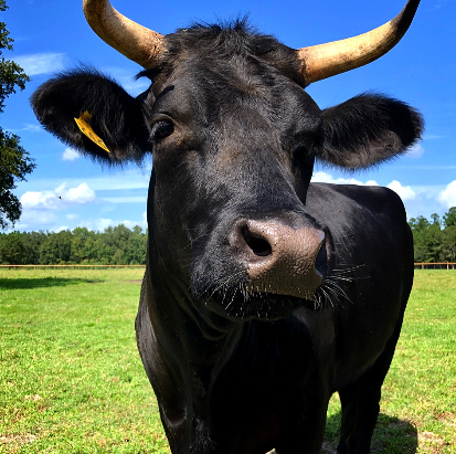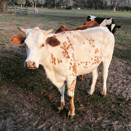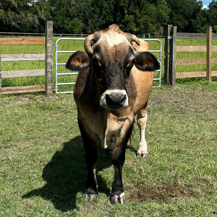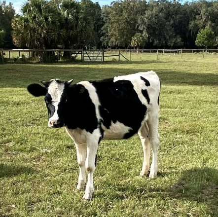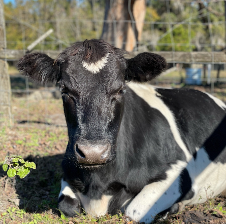 George Harrison Valentino is a Holstein mix who was meant to be a veal calf, but he was so cute and sweet that a UF student (thankfully) rescued him. He was hand-raised by kind people, but he eventually got really lonely and started to break out of his pasture looking for other cows. That led his family to find CCFS, where he could become part of a herd. He’s obviously a giant puppy, just watch out for his horns!