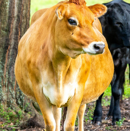 Fawn is a big, beautiful Jersey girl with gorgeous eyes. Not a mean bone in her body. Likes to be pet, but may not like strangers. She also likes to moo with her mouth closed. Fawn is a good friend of Claire, but is not allowed to push her around. Due to her, umm… roundness, many ask if Fawn is pregnant. She is not. She has just always been a full-figured moo-person. Cows come in all shapes and sizes, and we love them all!