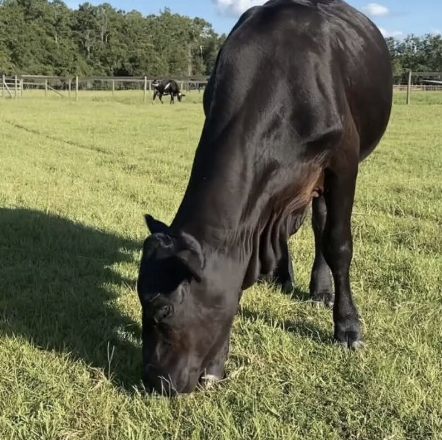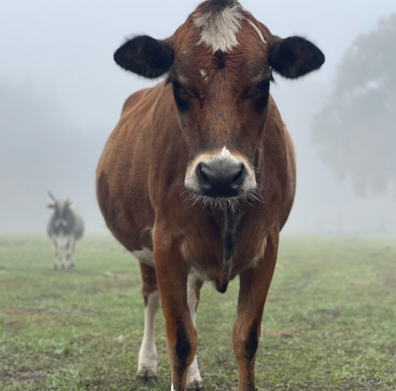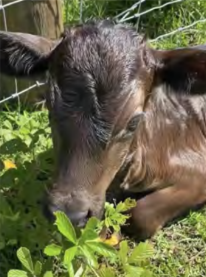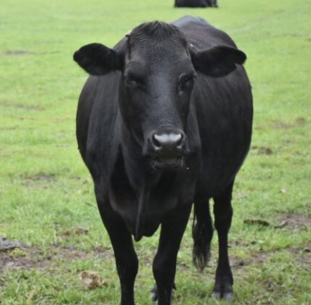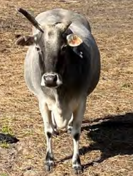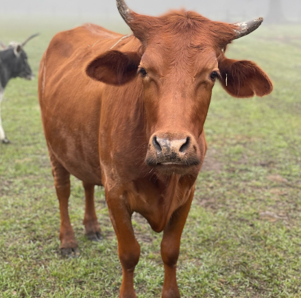 Claire is the herd leader (matriarch) and can often be seen lurking in the back of the herd, watching over everyone, making sure no funny business is about. She isn’t a fan of being pet, but she might come up for cow cookies. She is more than likely a Brangus cow, but more Brangman than Angus.