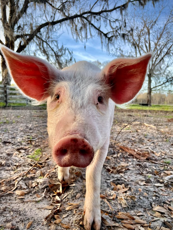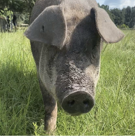 In mid-January 2023, Sisu Refuge in North Carolina received a call about a little piglet the sheriff’s office found during a meth lab bust. As you can imagine, Noodle wasn’t living in the greatest conditions. Sisu was at capacity (and then some) at the time of his rescue, so we gladly offered to be his forever home. Upon his arrival, he immediately bonded with Potato, and the two have been inseparable ever since. Noodle is an absolute sweetheart and loves to be pet. Watch out, though… he’s a shoe nibbler!