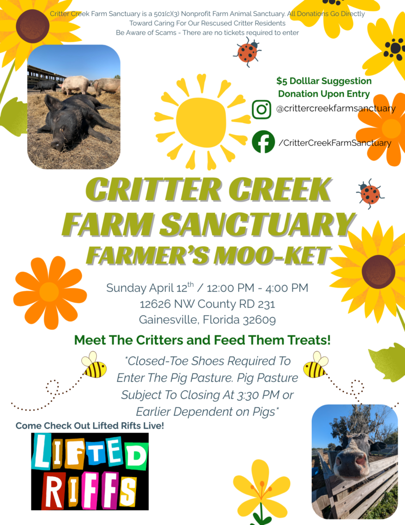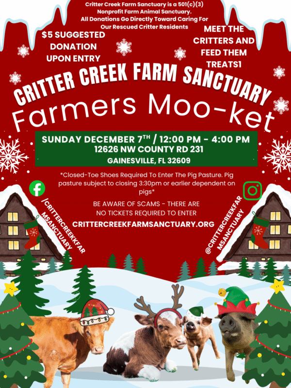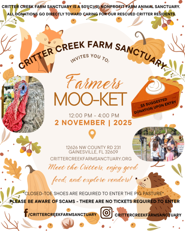 If you would like to meet our residents, we host a monthly plant-based farmers moo-ket at the Critter Creek facility, during which you can browse our vendors and meet the critters. All products sold at the event are 100% plant-based. There are interactive tours of the pig pasture, and you also have the opportunity to feed the cows treats over the fence.