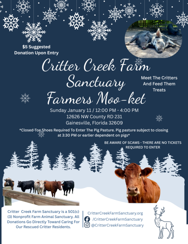 If you would like to meet our residents, we host a monthly plant-based farmers moo-ket at the Critter Creek facility, during which you can browse our vendors and meet the critters. All products sold at the event are 100% plant-based. There are interactive tours of the pig pasture, and you also have the opportunity to feed the cows treats over the fence.